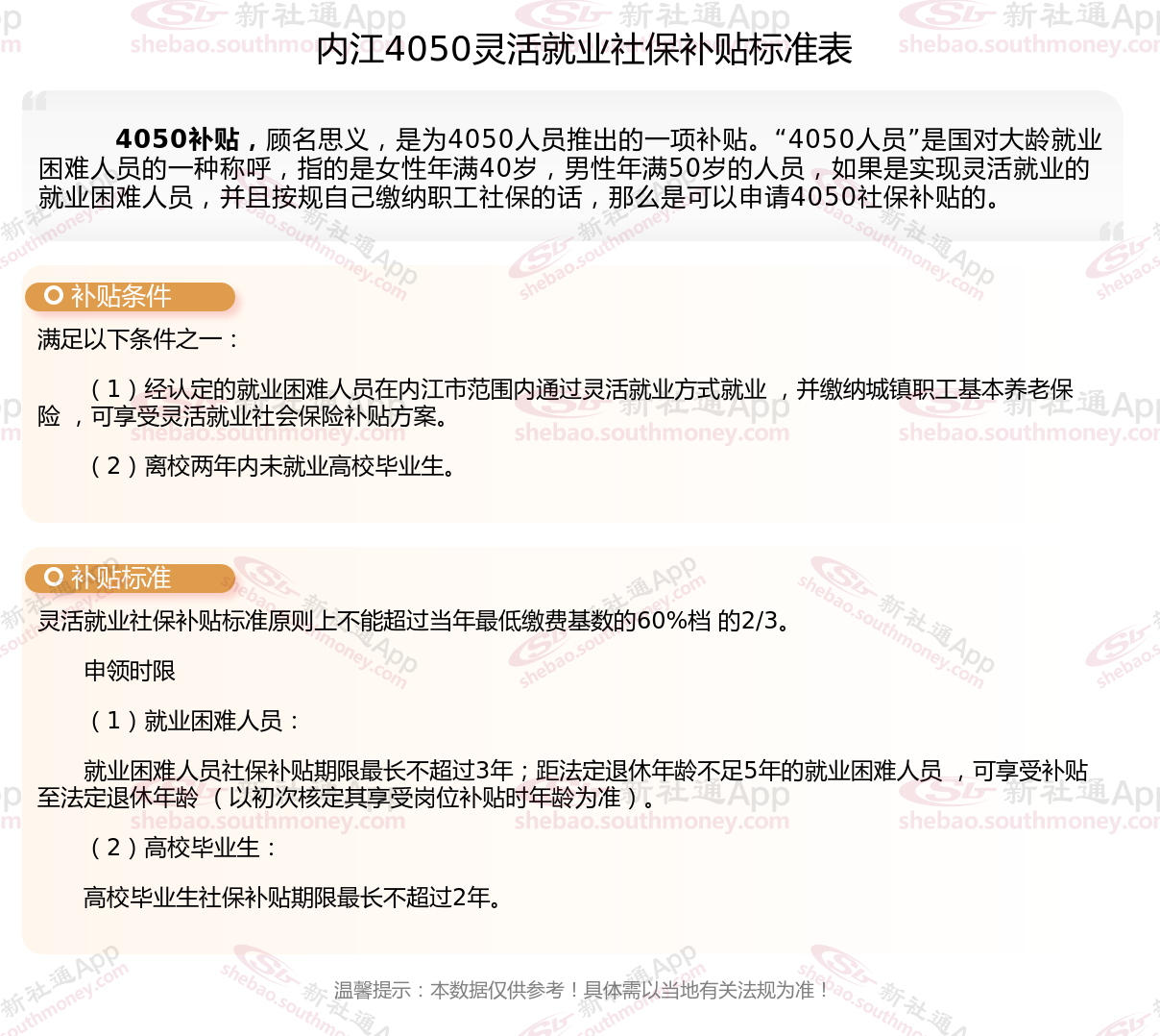 2025内江灵活就业4050社保补贴是一项面向特定年龄段的就业困难人群的社会保险补贴。