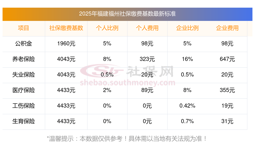 2025年福建福州社保缴费多少钱?下表是2024-2025年福建福州社保费用明细参考,新社通app-社保缴费查询工具提供的最新数据如下: