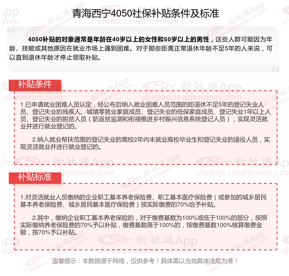 二、青海西宁4050社保补贴标准及条件2025年,最新如下