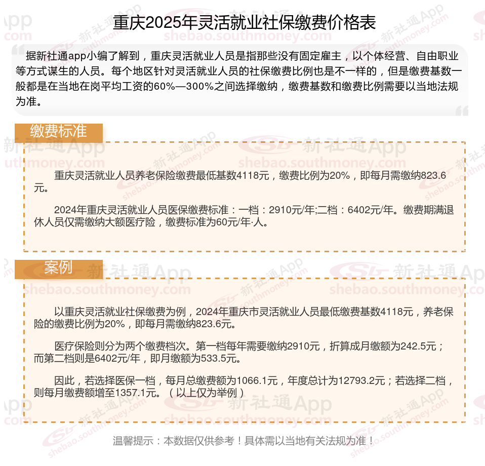 2025年重庆灵活就业人员社保需要交多少钱?随着经济社会的不断发展,灵活就业群体也日益壮大,其社保缴费问题也愈发受到关注。接下来随新社通APP小编一起来看看灵活就业群体社保缴费问题吧。