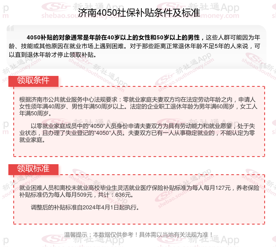 二、2025年济南4050社保补贴标准及条件,最新如下: