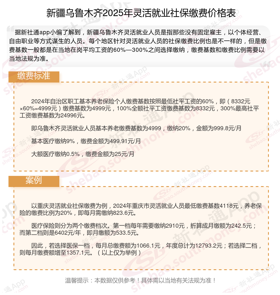 二、2025年新疆乌鲁木齐灵活就业社保缴费基数及比例最新消息