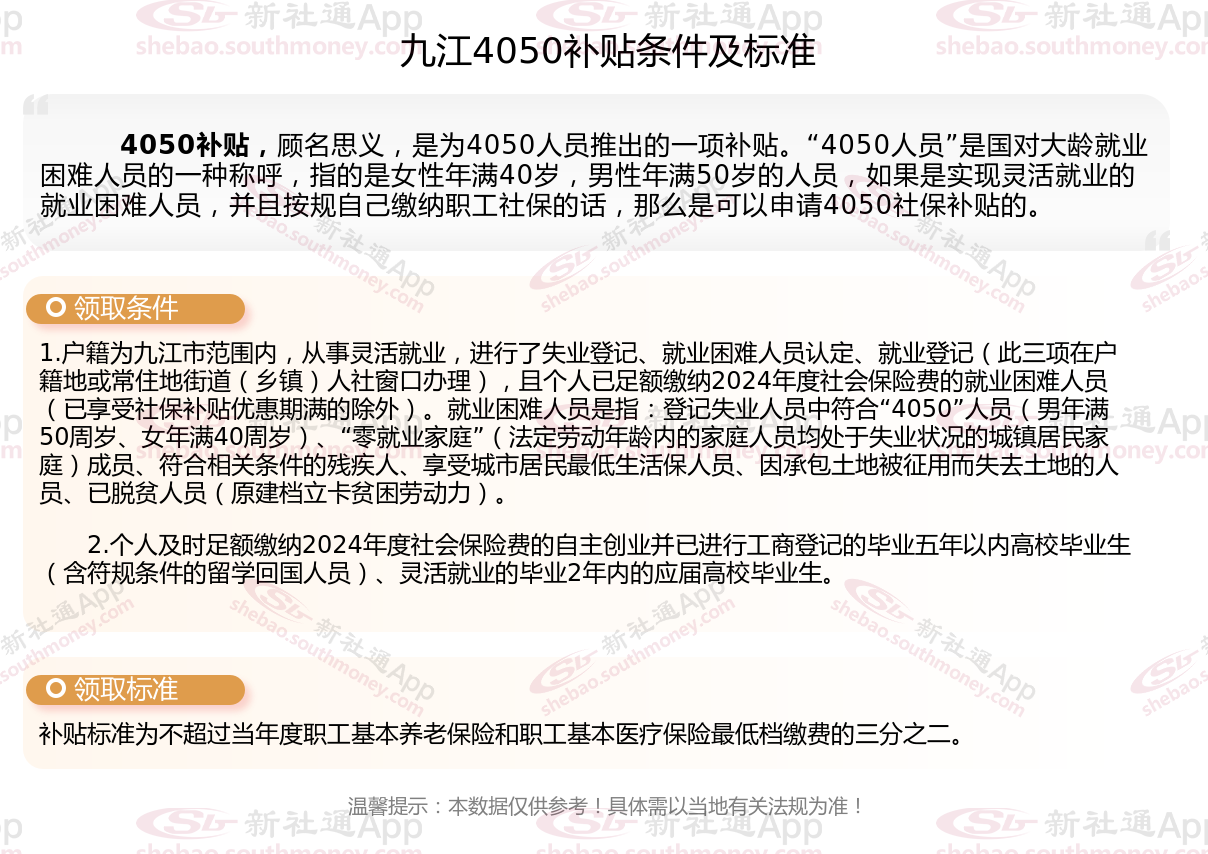 4050社保补贴标准据新社通app小编了解,通常,4050社保补贴包含基本医疗保险和基本养老保险两个险种,社保补贴金额为申请人实际缴纳基本养老保险和基本医疗保险金额的2/3,具体标准以当地社保局公布的数据为准!那么九江4050灵活就业困难人员社保补贴标准是多少?九江4050社保补贴需要符合什么条件?接下来随新社通APP小编具体了解一下4050社保补贴内容。