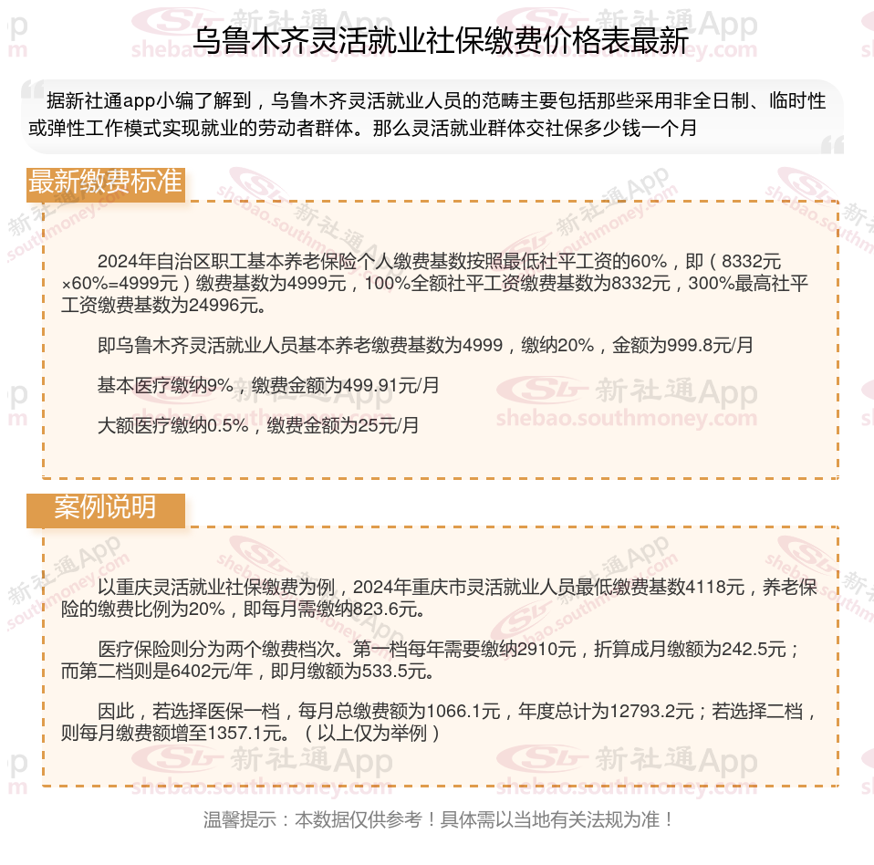 乌鲁木齐灵活就业自己交社保一个月要交多少钱?灵活就业人员社保缴费按什么档次缴纳好,怎么选择划算?根据新社通app-社保缴费查询工具提供的最新数据如下: