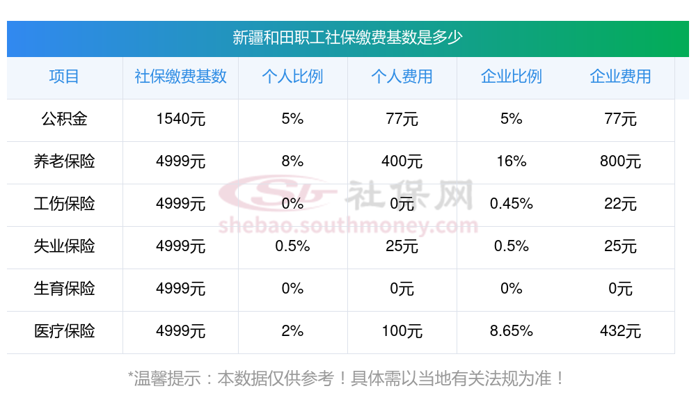 2025年新疆和田五险缴费标准是多少,2025年新疆和田社保缴费多少钱?下表是2025年新疆和田社保费用明细参考,新社通app-社保缴费查询工具提供的最新数据如下: