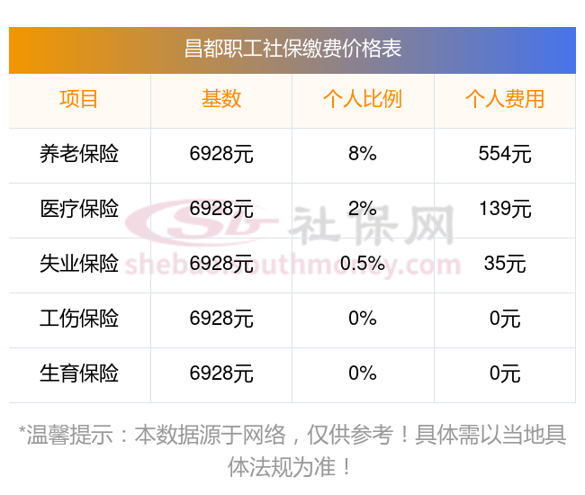 2025年昌都社保缴费价格表最新消息?昌都社保交多少钱一个月?下表是2024-2025年昌都社保费用明细参考,新社通app-社保缴费查询工具提供的最新数据如下: