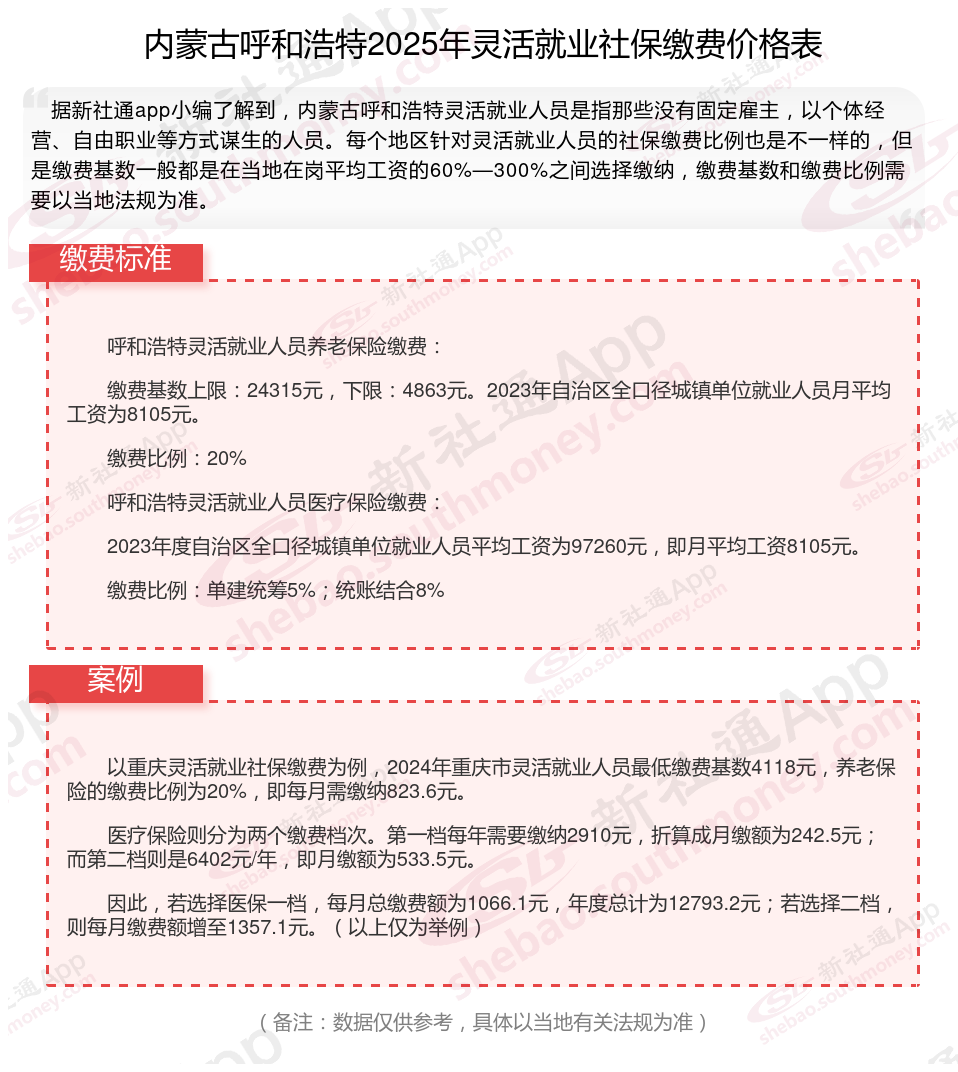 据新社通app数据显示,内蒙古呼和浩特灵活就业人员养老缴费基数2024-2025年最新标准如下: