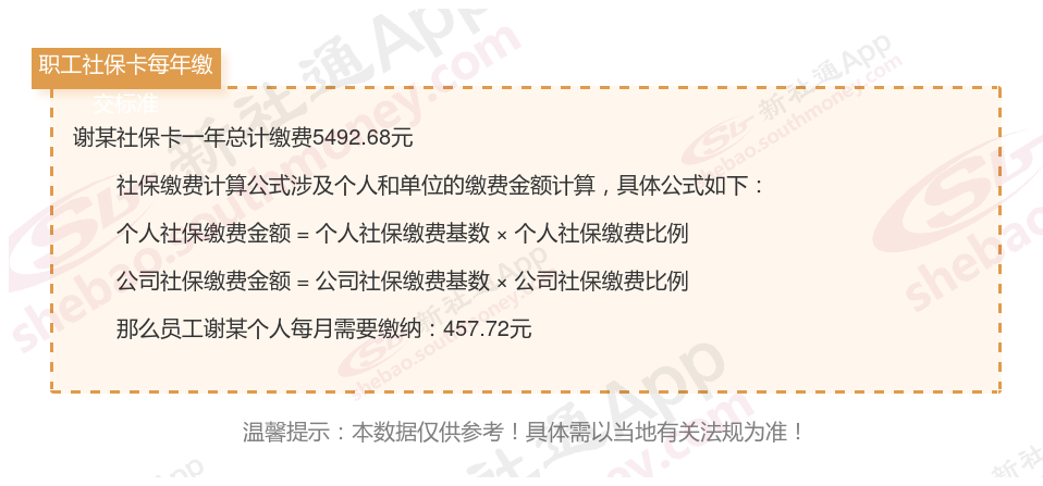 由上图得知,谢某社保卡一年需要缴纳5492.68元,个人部分每月需要缴纳457.72元,若您想要了解明细点击新社通社保计算器,来了解一下明细吧。