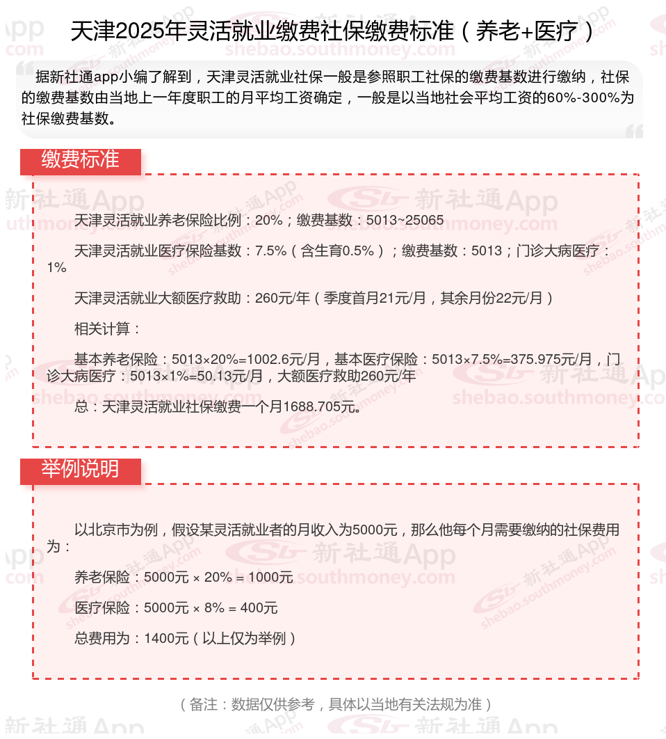 据新社通app数据显示,天津灵活就业人员养老缴费基数2024-2025年最新标准如下: