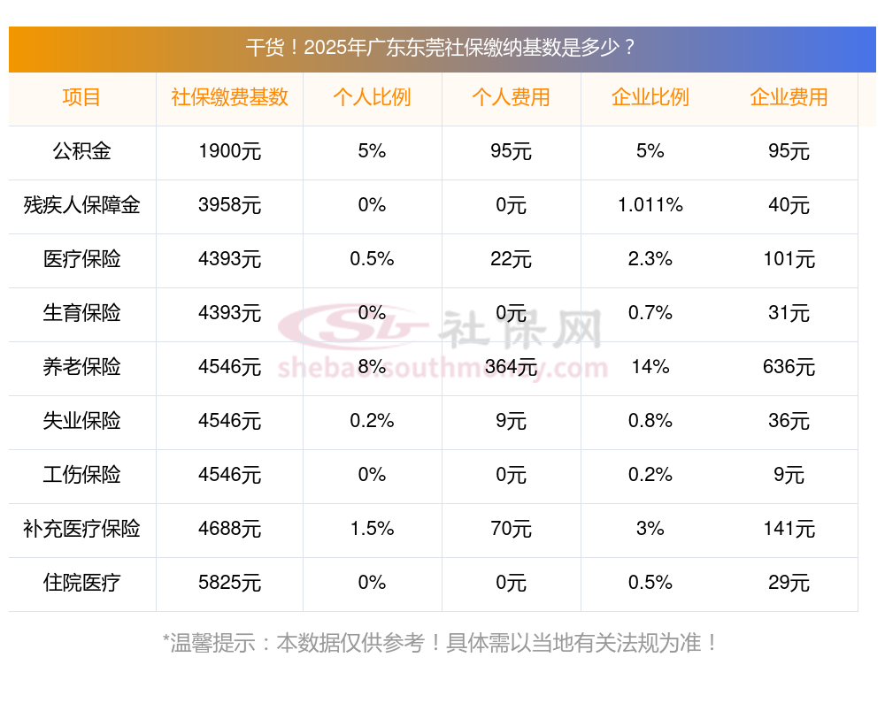2025社保交多少钱?下表是2025年广东东莞社保费用明细参考,新社通app-社保缴费查询工具提供的最新数据如下: