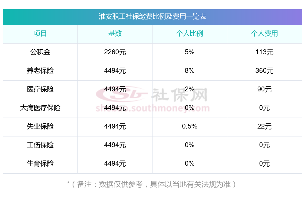 2025年淮安社保缴费多少钱?下表是2023-2024年淮安社保费用明细参考,新社通app-社保缴费查询工具提供的最新数据如下: