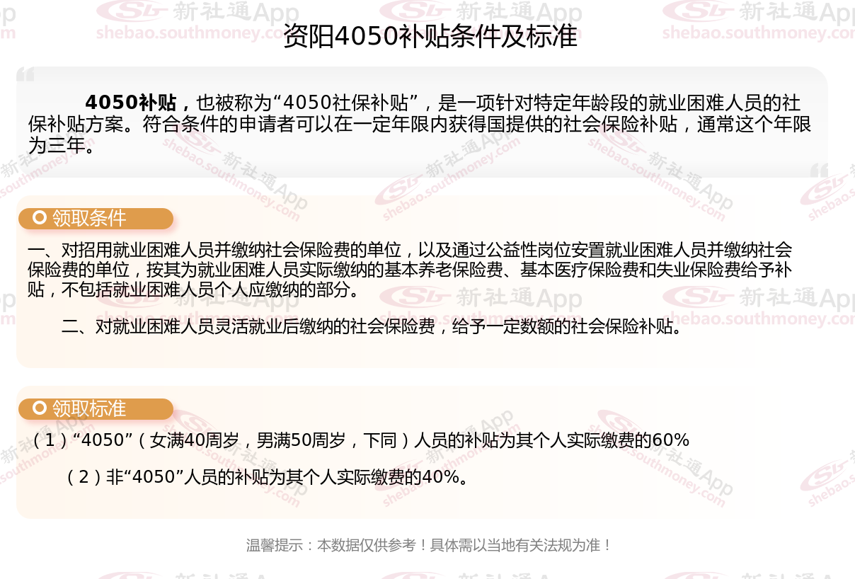 资阳4050社保补贴多少钱一个月?资阳4050社保补贴2025年最新标准是多少?2025资阳4050补贴主要针对的是年龄在40岁以上的女性和50岁以上的男性,这些人群通常因为年龄较大而面临就业困难。
