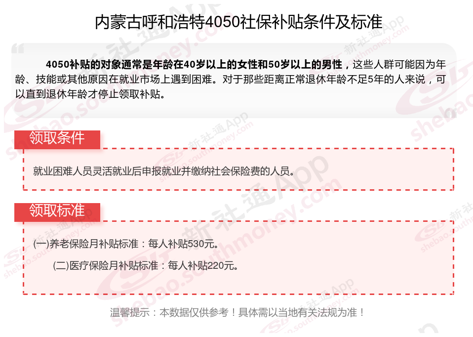 一、2025年内蒙古呼和浩特4050社保补贴标准是怎么样的,附领取条件