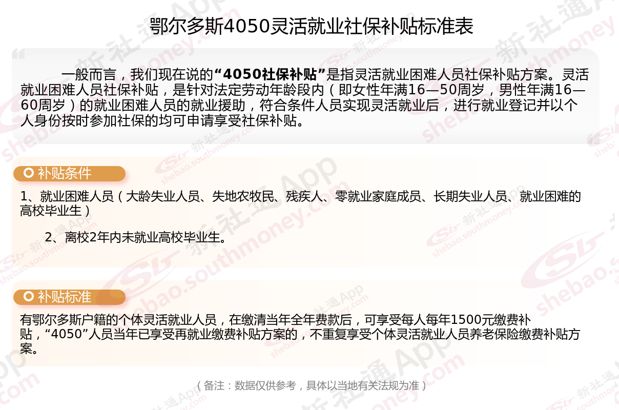 二、2025年鄂尔多斯4050社保补贴标准及条件,最新如下: