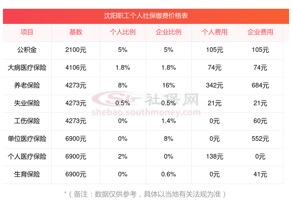 2025年沈阳5险缴费标准,2025年沈阳社保缴费多少钱?下表是2025年沈阳社保费用明细参考,新社通app-社保缴费查询工具提供的最新数据如下: