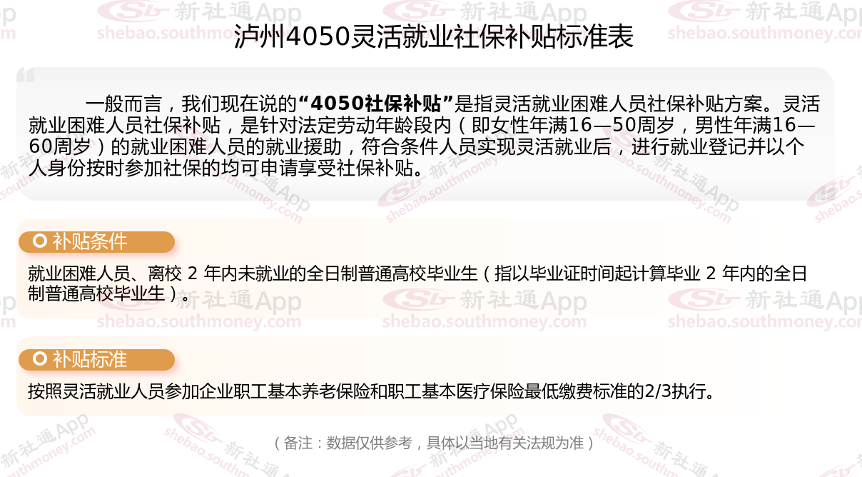 一、2025年泸州灵活就业4050社保补贴标准及条件是什么