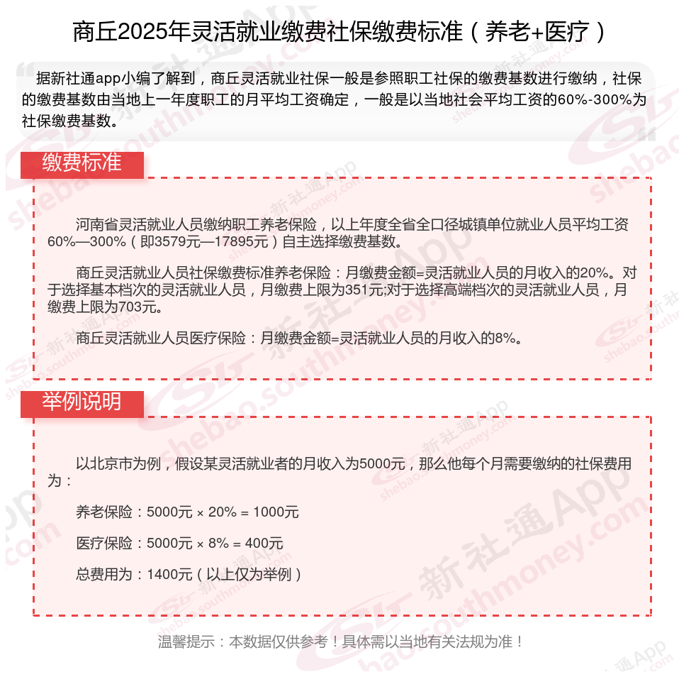以上就是带来商丘灵活就业社保缴费标准相关知识,内容供参考,希望对你有帮助,欢迎关注/下载新社通APP解锁更多社保专业资讯。