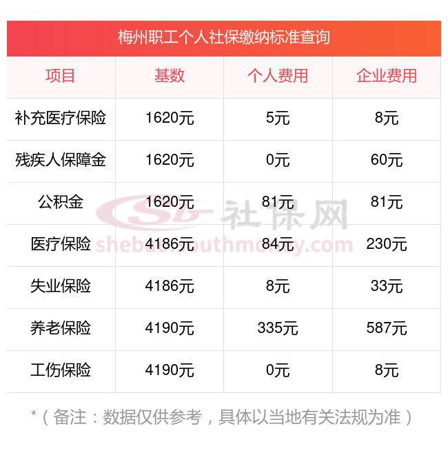2025年梅州五险缴费标准是多少,2025年梅州社保缴费多少钱?下表是2025年梅州社保费用明细参考,新社通app-社保缴费查询工具提供的最新数据如下: