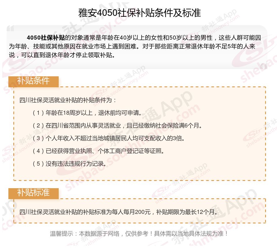 一、2023-2024年雅安4050社保补贴标准及条件是多少?