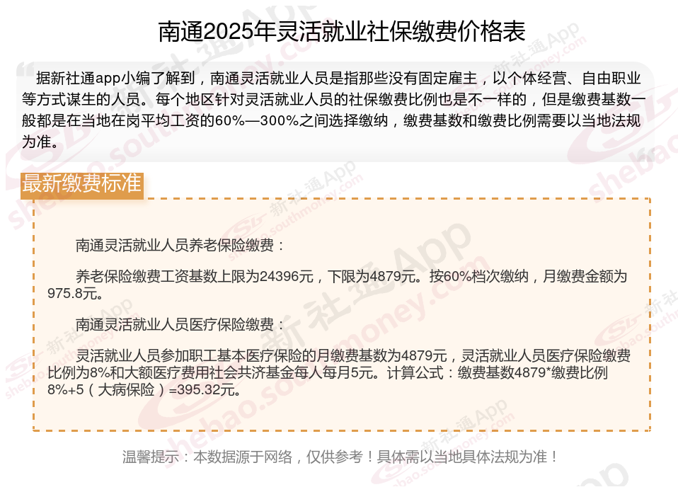 2025年南通灵活就业人员社保需要交多少钱?灵活就业,作为一种非传统的就业方式,近年来蓬勃发展。为保护这部分人群的权益,国制定了相应的社保缴费法规。2024年,灵活就业社保缴费法规继续完善,涵盖了养老保险、医疗保险、失业保险等多个方面,旨在为灵活就业人员提供全面的社会保证。接下来随新社通APP小编一起来看看。