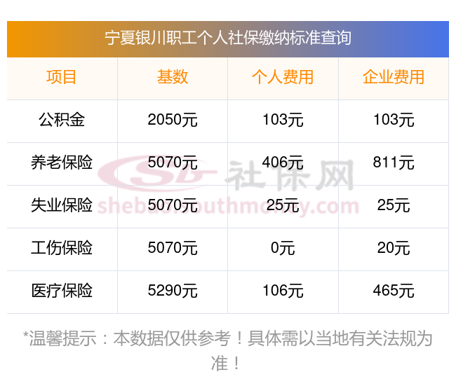 2025年宁夏银川社保缴费多少钱?下表是2024-2025年宁夏银川社保费用明细参考,新社通app-社保缴费查询工具提供的最新数据如下: