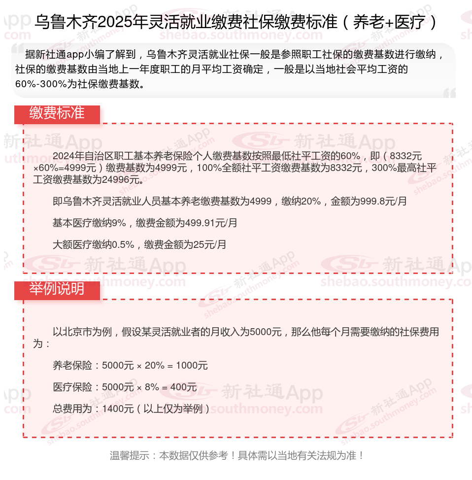 据新社通app数据显示,2024-2025年乌鲁木齐灵活就业人员养老保险的缴费标准是根据缴费基数来确定的: