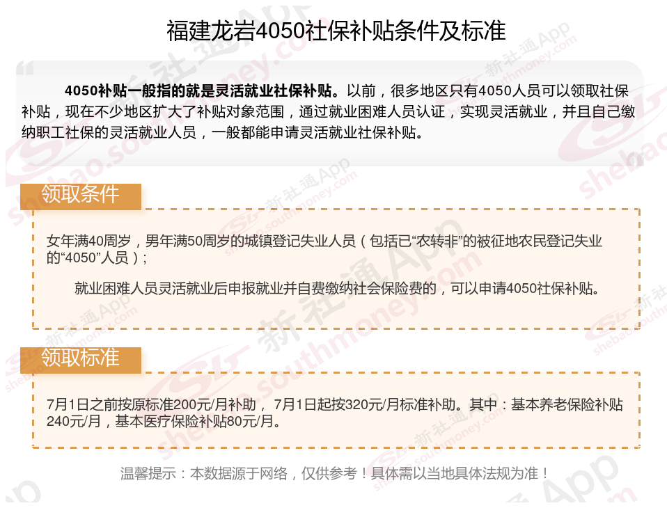 二、福建龙岩4050社保补贴多少钱一个月?福建龙岩4050社保补贴2025年最新标准是多少?