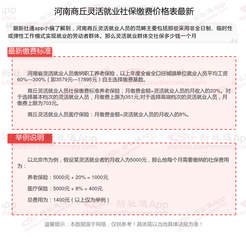 据新社通app数据显示,2024-2025年河南商丘灵活就业人员养老保险的缴费标准:
