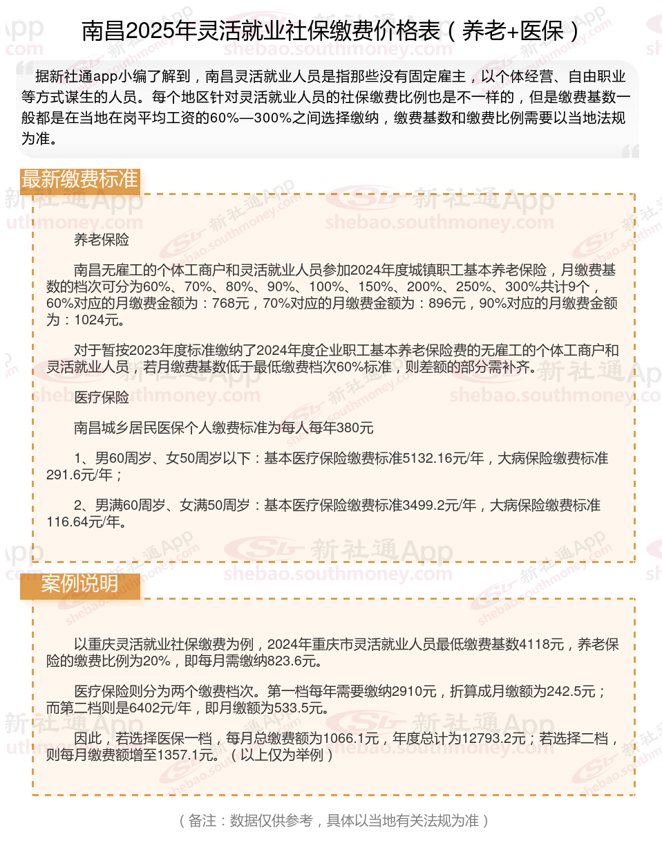 据新社通app数据显示,南昌灵活就业人员养老缴费基数2024-2025年最新标准如下: