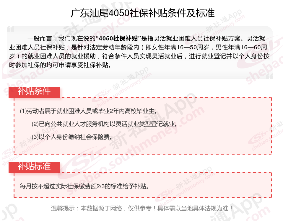 二、2025年广东汕尾4050社保补贴标准及条件,最新如下: