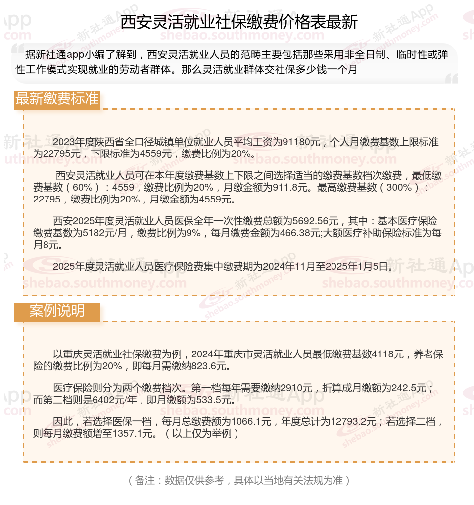 据新社通app数据显示,2024-2025年西安灵活就业人员养老保险的缴费标准: