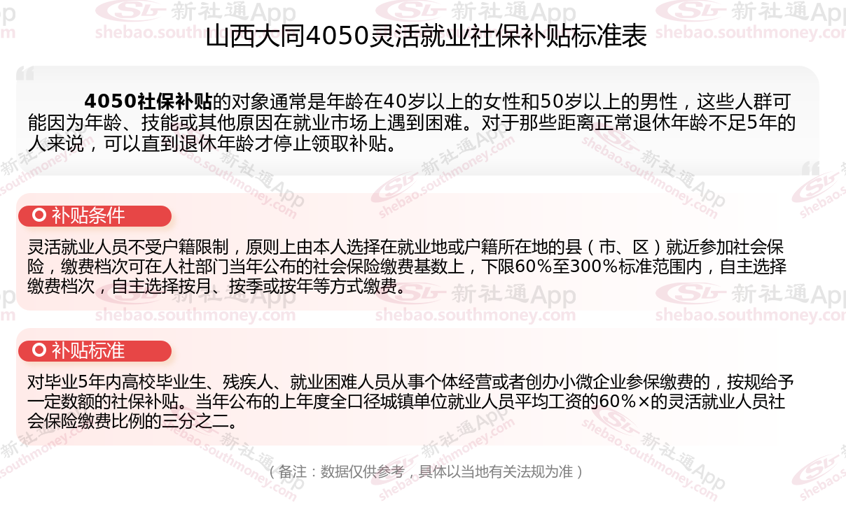 以上就是山西大同4050灵活就业社保补贴的相关内容,欢迎关注新社通/下载新社通APP了解更多五险一金专业资讯。