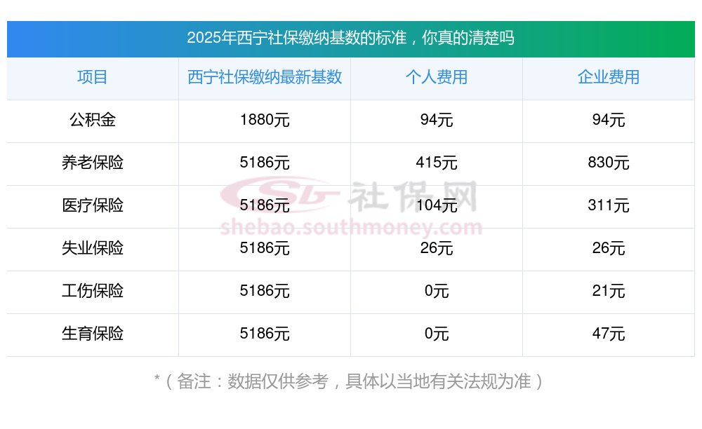 2025年西宁社保缴费最低基数及个人和单位具体是多少钱?下表是2025年西宁社保费用明细参考,新社通app-社保缴费查询工具提供的最新数据如下: