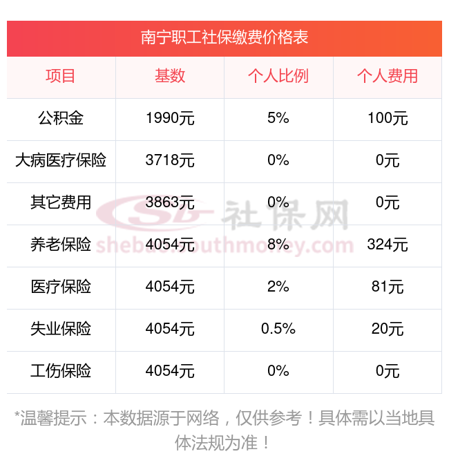 2025年社保缴费价目表,下面和社保网app一起来了解下2024-2025年南宁最低配社保费用明细参考,新社通app-社保缴费查询工具提供的最新数据如下: