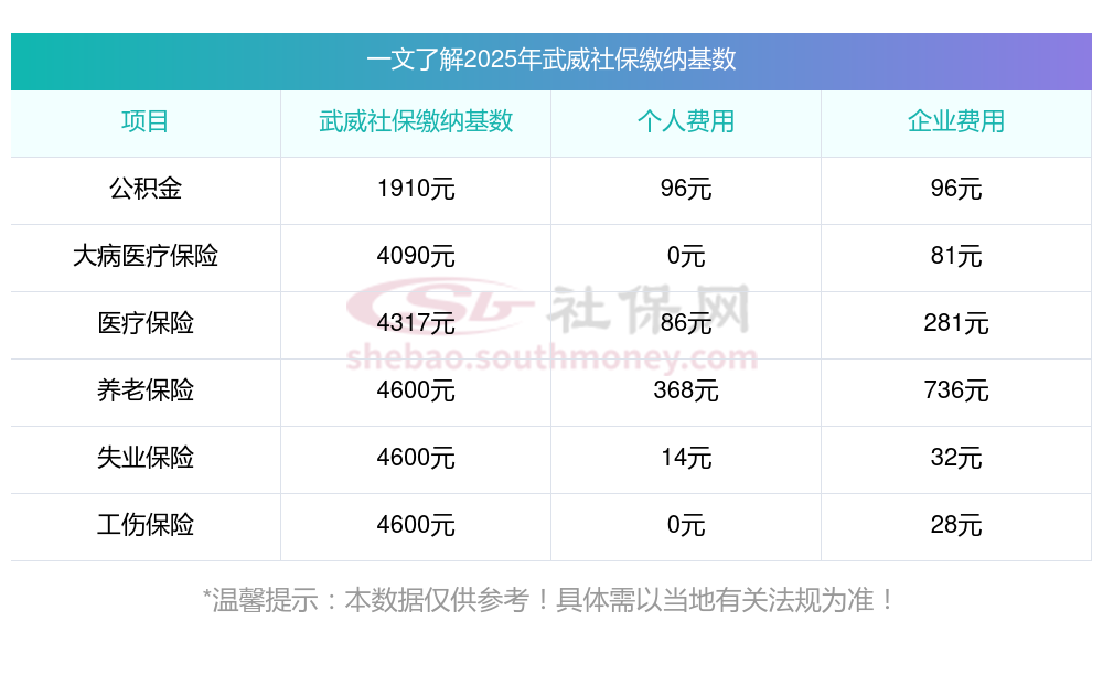 武威2025年养老保险缴费标准是多少?下表是2025年武威社保费用明细参考,新社通app-社保缴费查询工具提供的最新数据如下: