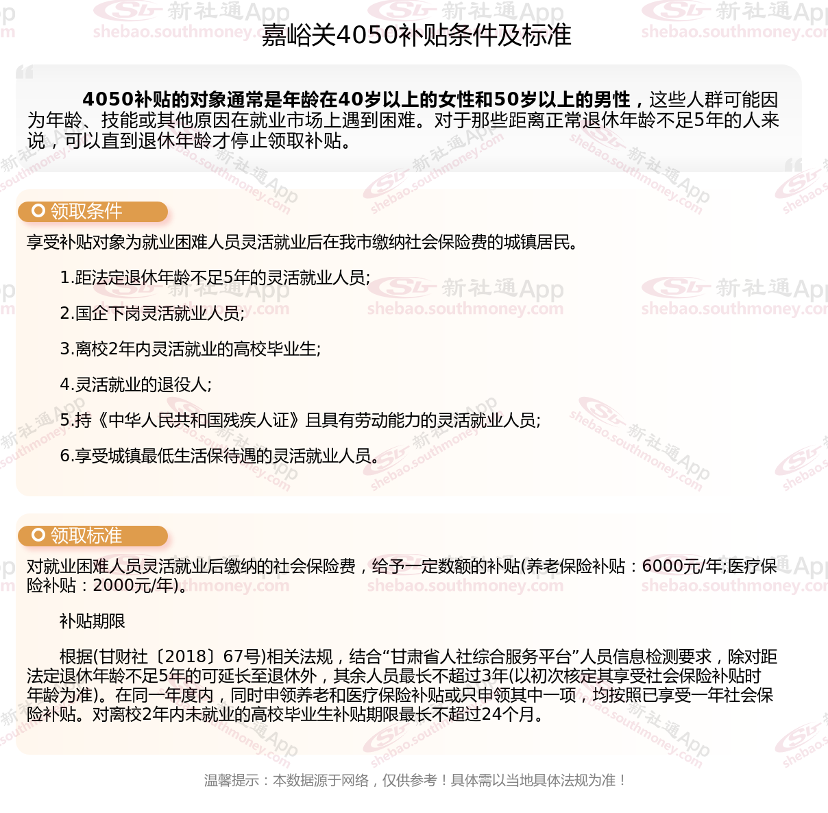 一、嘉峪关4050社保补贴标准及条件2025年最新消息