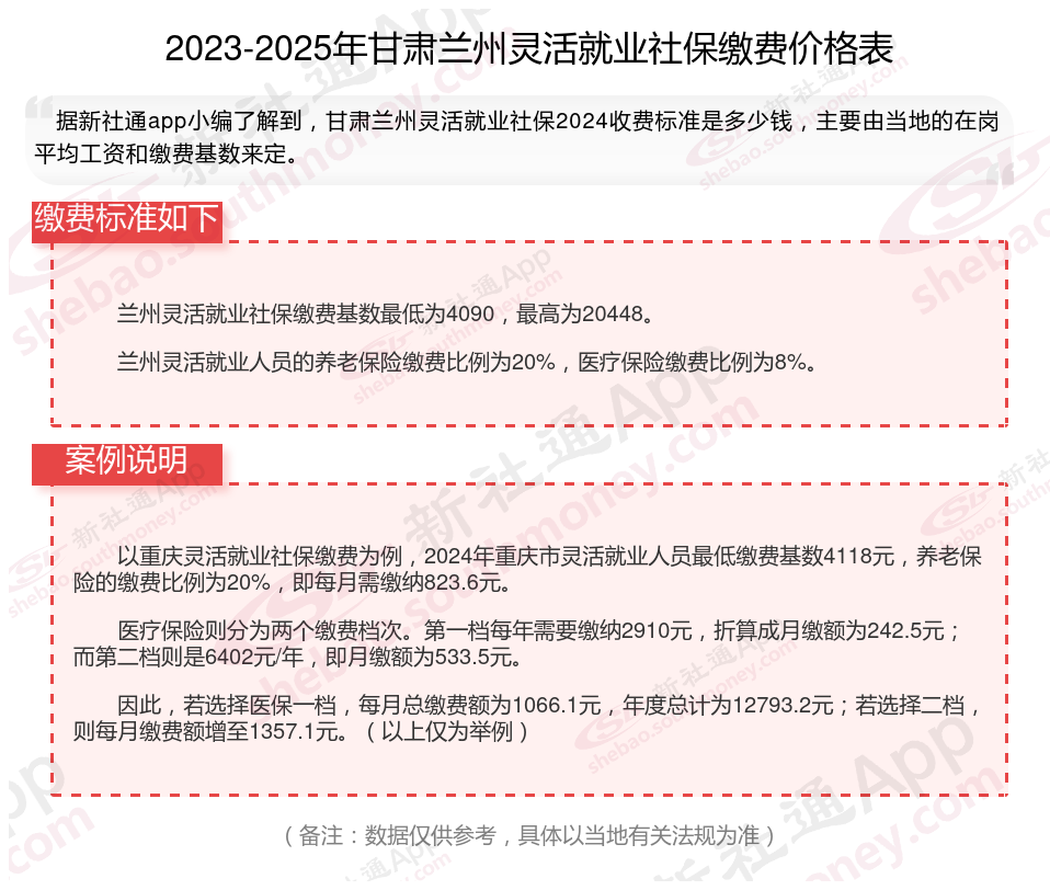 兰州灵活就业社保缴费基数最低为4090,最高为20448。