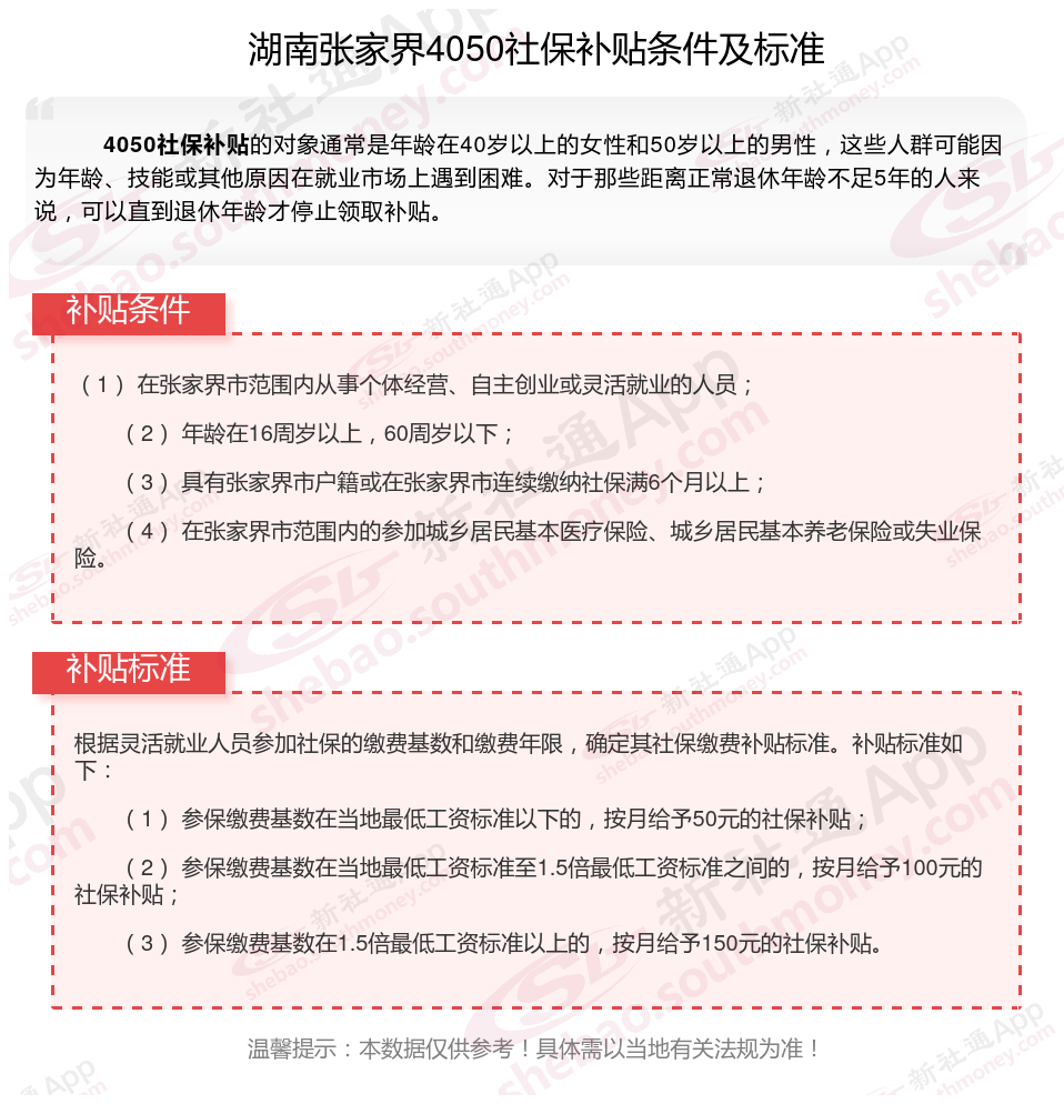 一、2023-2024年湖南张家界4050社保补贴标准及条件是多少?