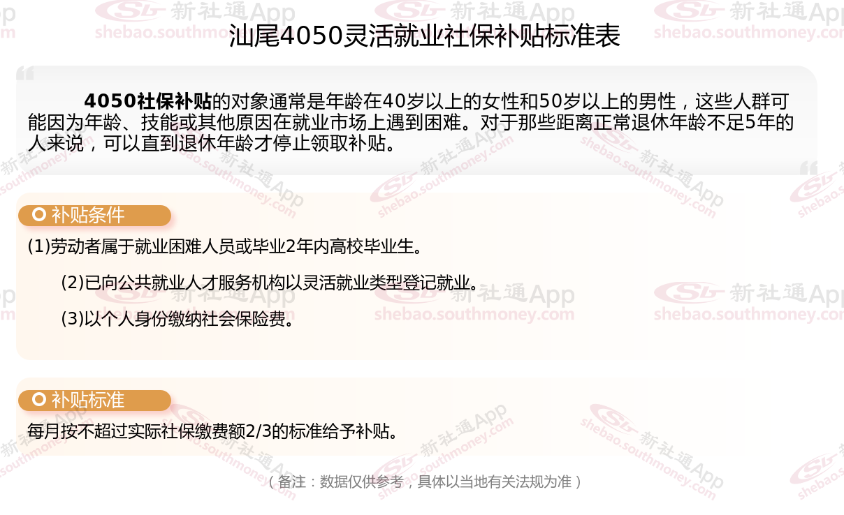 二、2025年汕尾4050社保补贴标准及条件是什么?