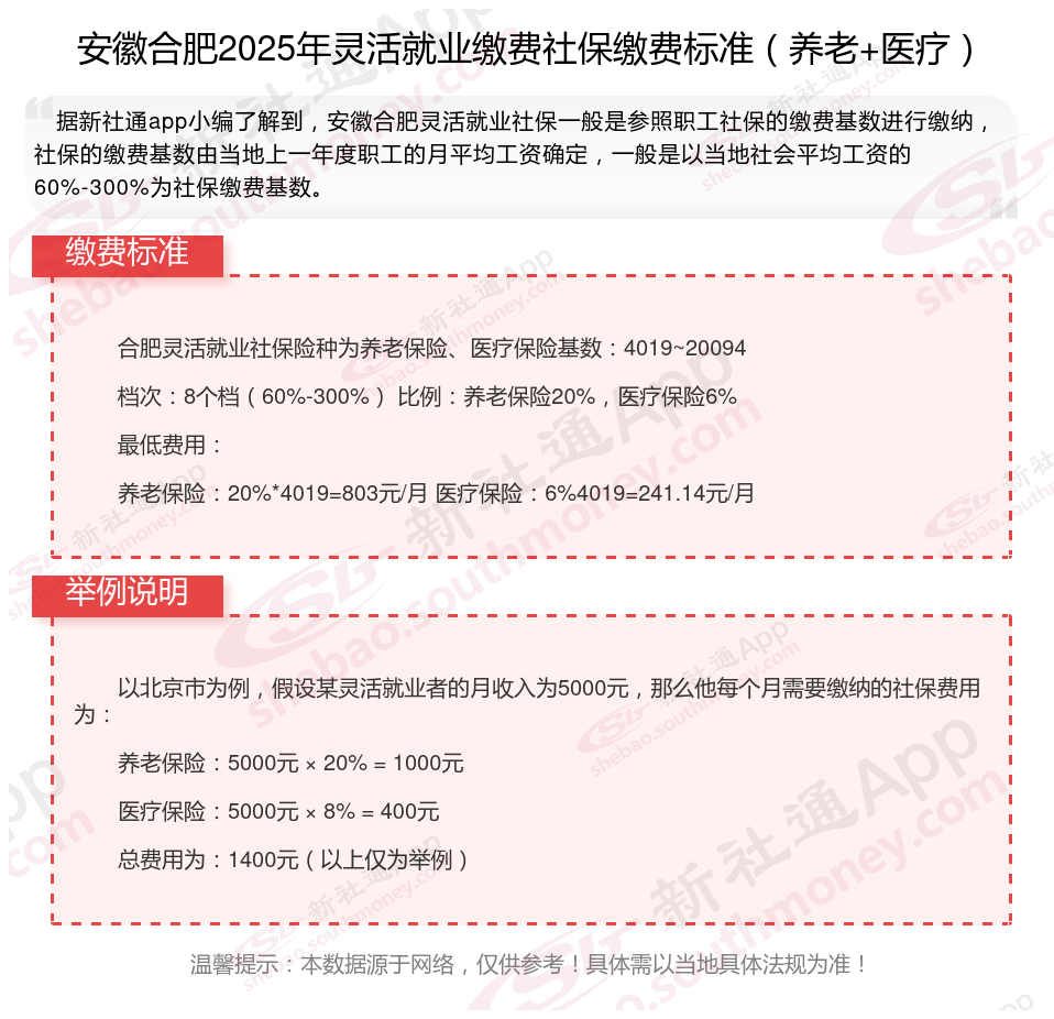 据新社通app数据显示,安徽合肥灵活就业养老保险的缴费基数为:4227元。灵活就业人员参保缴费的比例为个人20%。