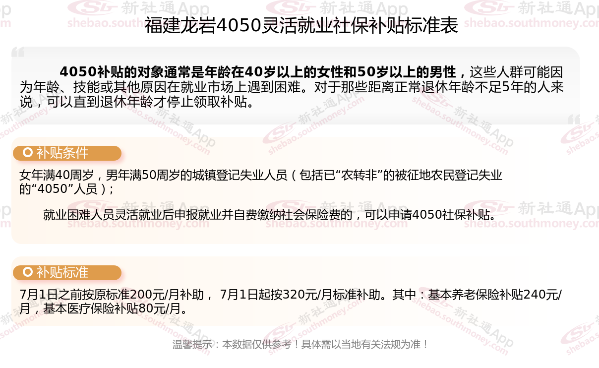 二、2025年福建龙岩4050社保补贴标准及条件是什么?