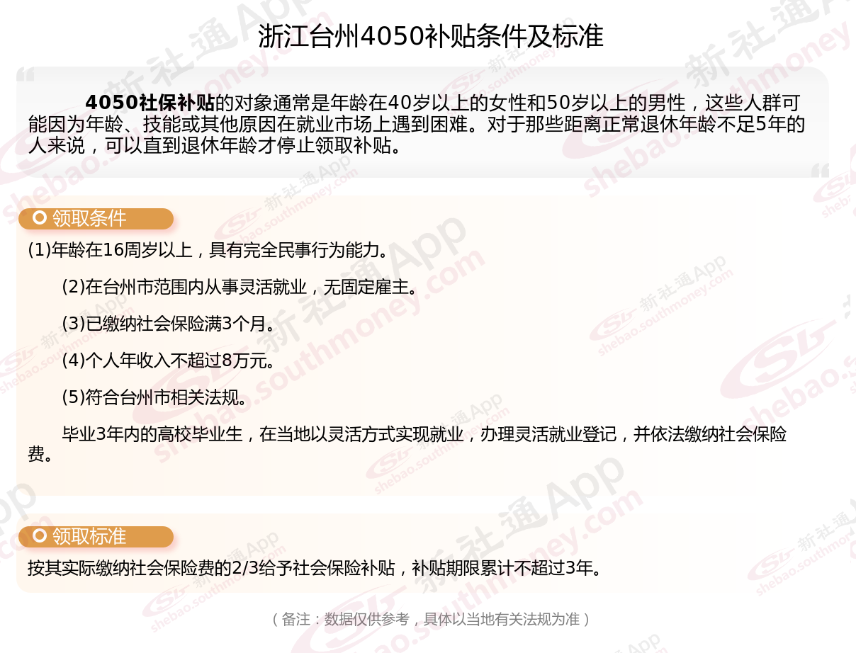 2025浙江台州灵活就业4050社保补贴是一项面向特定年龄段的就业困难人群的社会保险补贴。