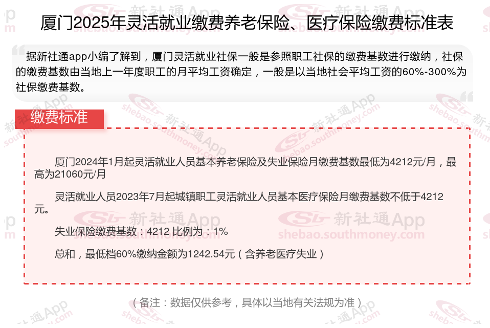 那么,厦门灵活就业人员社保交多少钱?买根据新社通app-社保缴费查询工具提供的2025社保缴费标准详情数据: