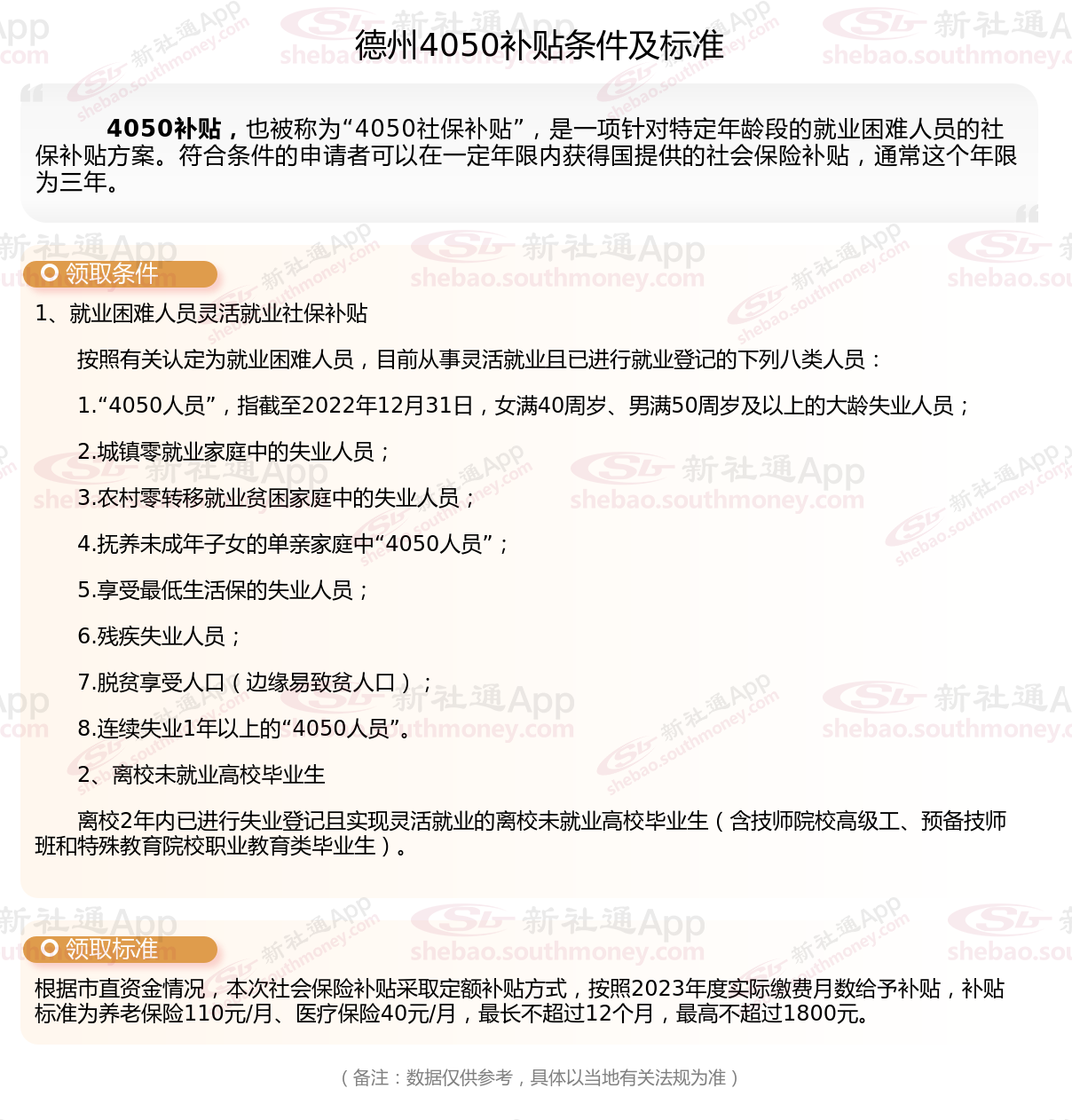 德州4050灵活就业社保补贴是什么?今天聊一下4050补贴话题。44050社保补贴标准据新社通app小编了解,通常,4050社保补贴包含基本医疗保险和基本养老保险两个险种,社保补贴金额为申请人实际缴纳基本养老保险和基本医疗保险金额的2/3,具体标准以当地社保局公布的数据为准!那么德州4050灵活就业社保补贴标准是多少钱?德州4050社保补贴可以领取多少?接下来随新社通APP小编了解一下德州4050灵活就业社保补贴的最新资讯。