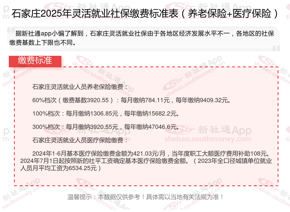 那么,石家庄灵活就业人员社保缴费标准2024-2025最新来了,交社保有什么好处?根据新社通app-社保缴费查询工具提供的2025社保缴费标准详情数据:
