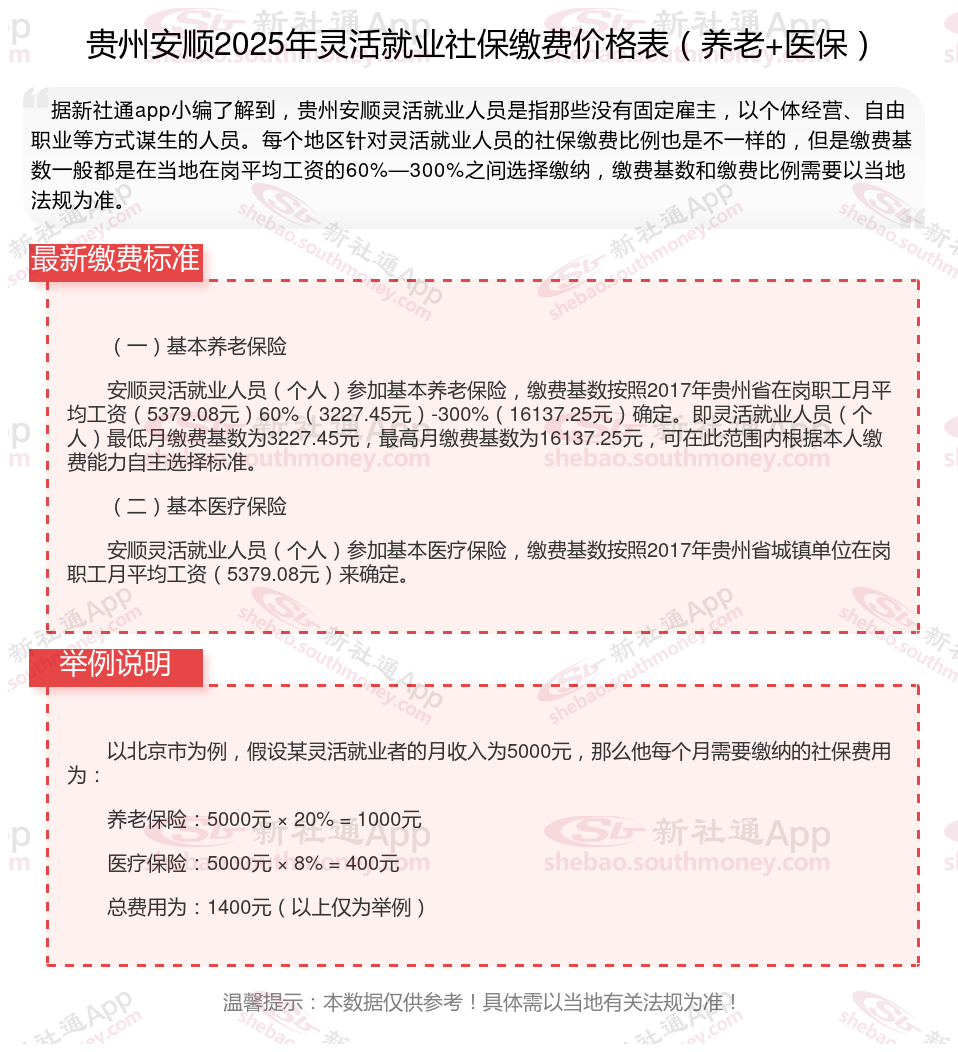 灵活就业社保是指针对灵活就业人员的社会保险制。灵活就业人员包括个体经营者、自由职业者、临时工等,他们没有固定的雇主,因此需要自行缴纳社会保险。那么2025年贵州安顺灵活就业人员社保需要交多少钱?下面随新社通小编一起来看看。
