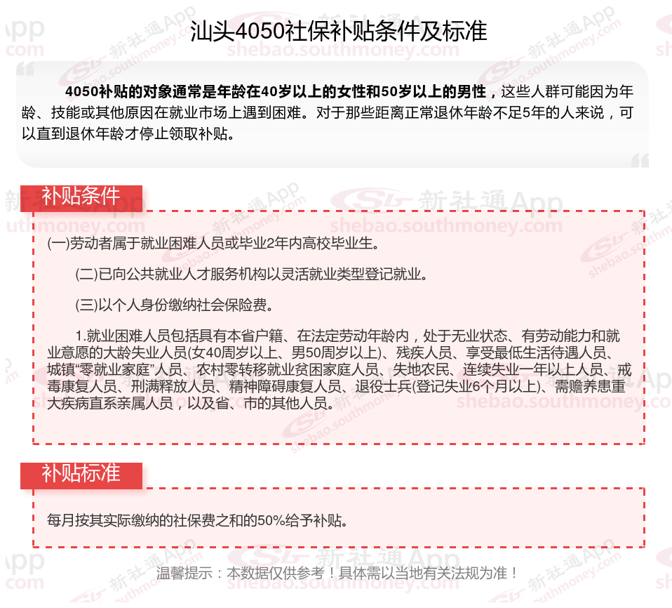 2025汕头4050补贴主要针对的是年龄在40岁以上的女性和50岁以上的男性,这些人群通常因为年龄较大而面临就业困难。