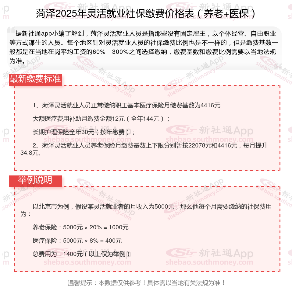 据新社通app数据显示,菏泽灵活就业人员养老保险缴费基数2024-2025年最新标准如下: