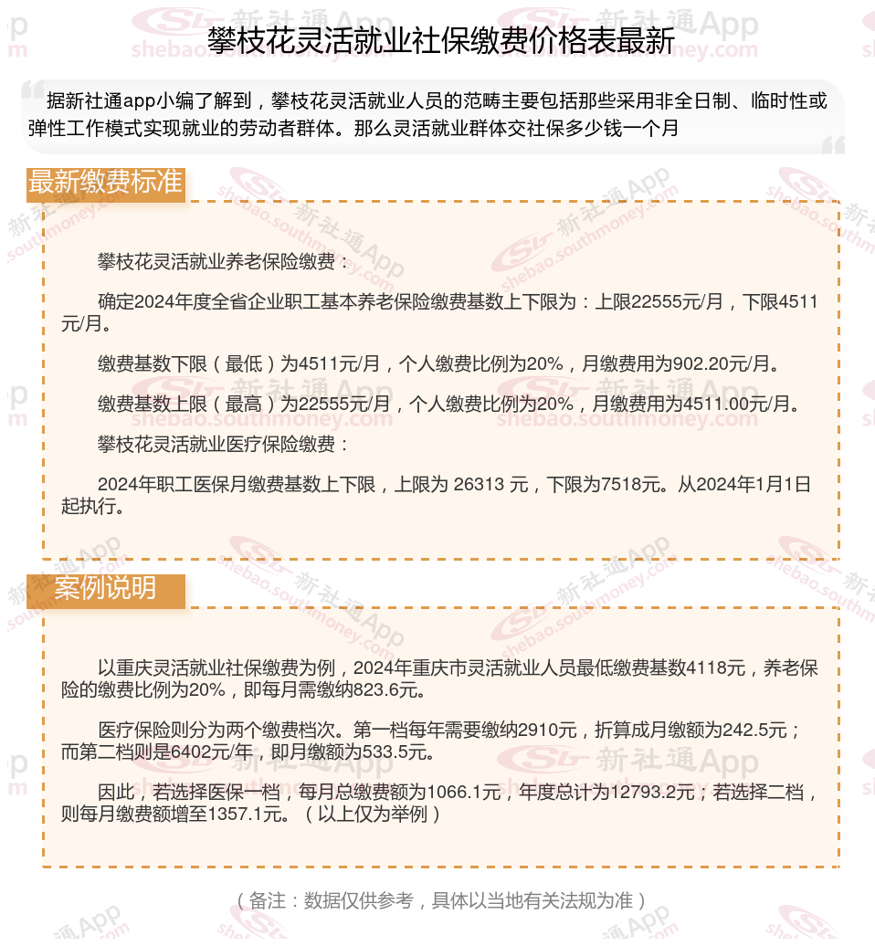据新社通app数据显示,攀枝花灵活就业养老保险缴费基数2024-2025年最新标准如下: