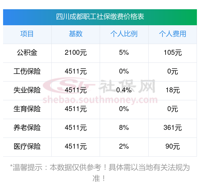 2025年四川成都社保缴费最低基数及个人和单位具体是多少钱?下表是2025年四川成都社保费用明细参考,新社通app-社保缴费查询工具提供的最新数据如下: